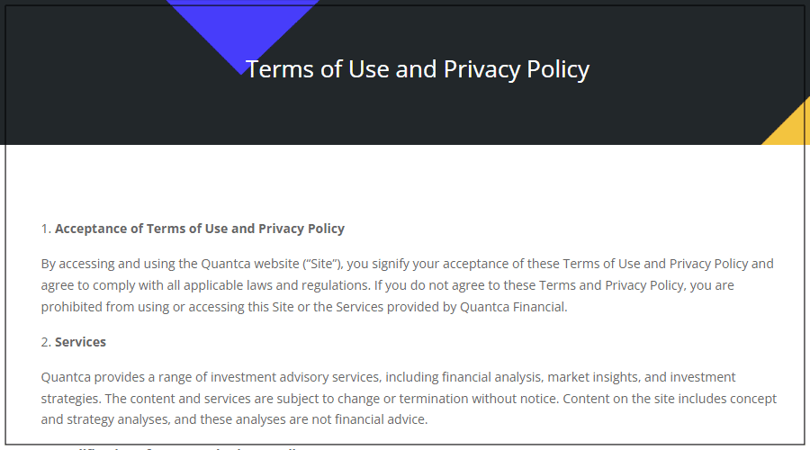 Contains: The Terms of Use and Privacy Policy outline the rules governing the use of Quantca’s services and website, as well as how client information is collected, used, and protected though the use of the website.